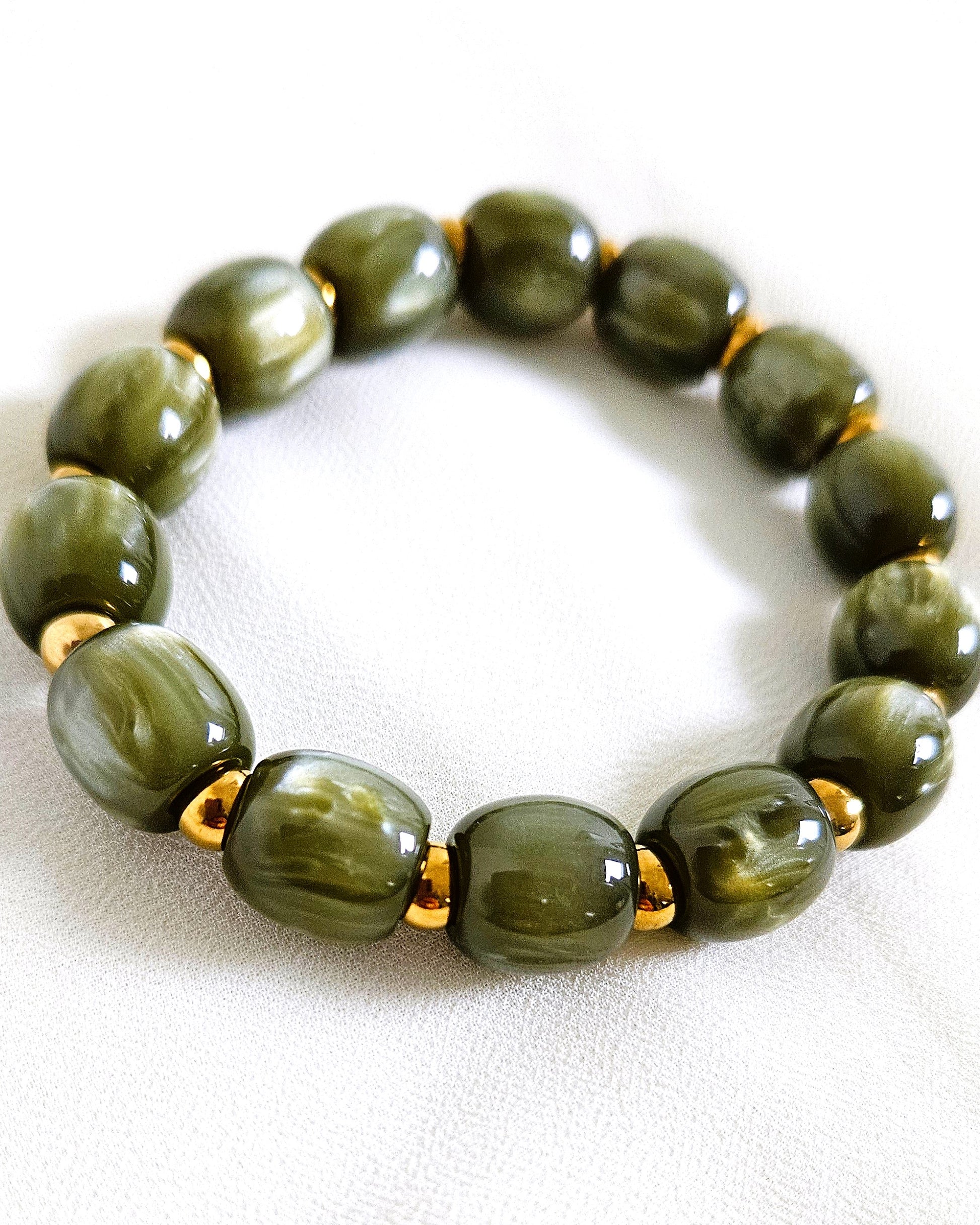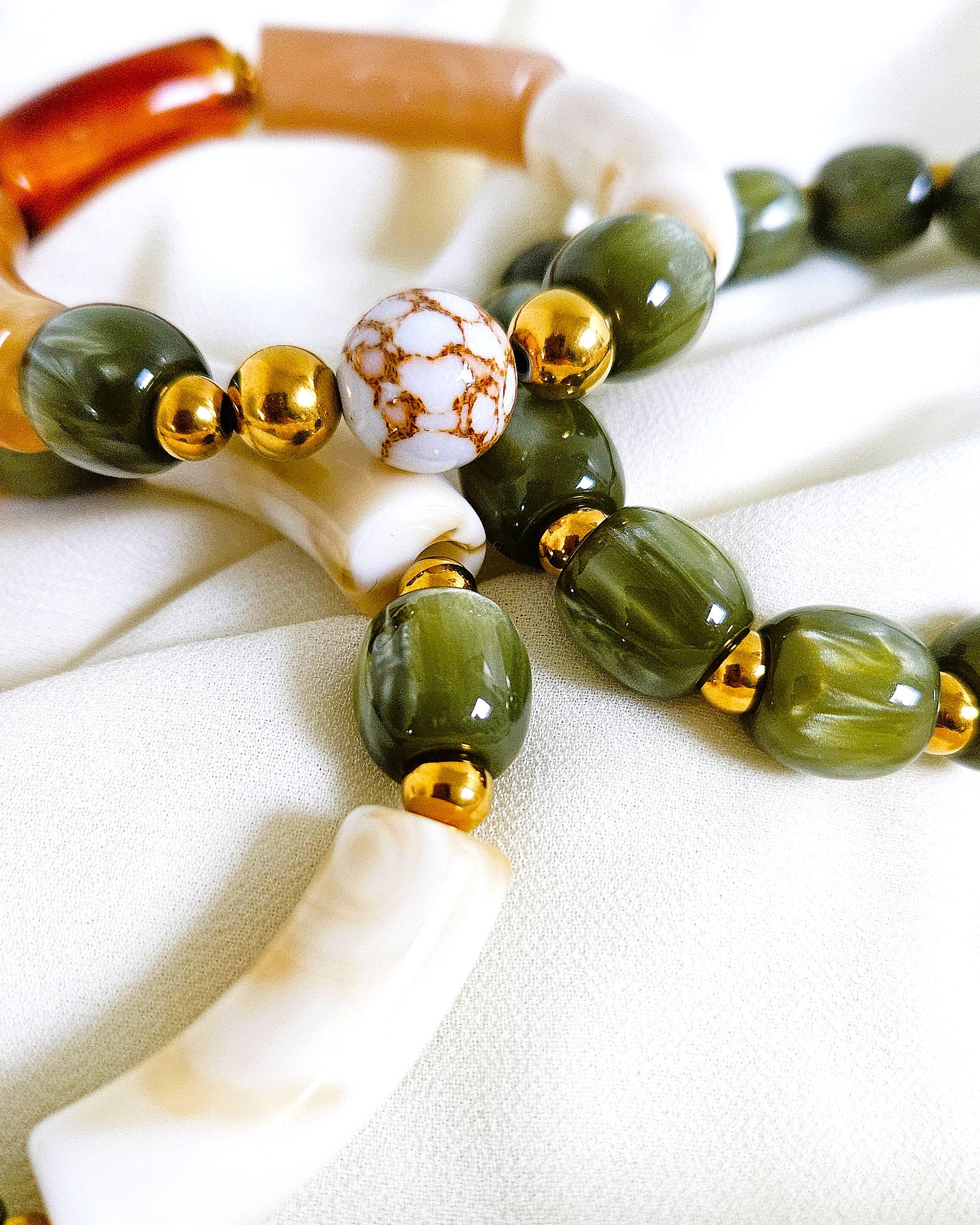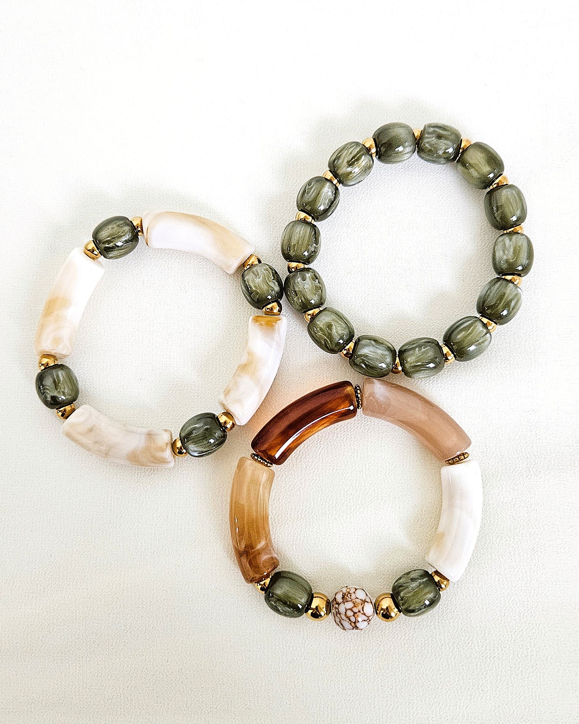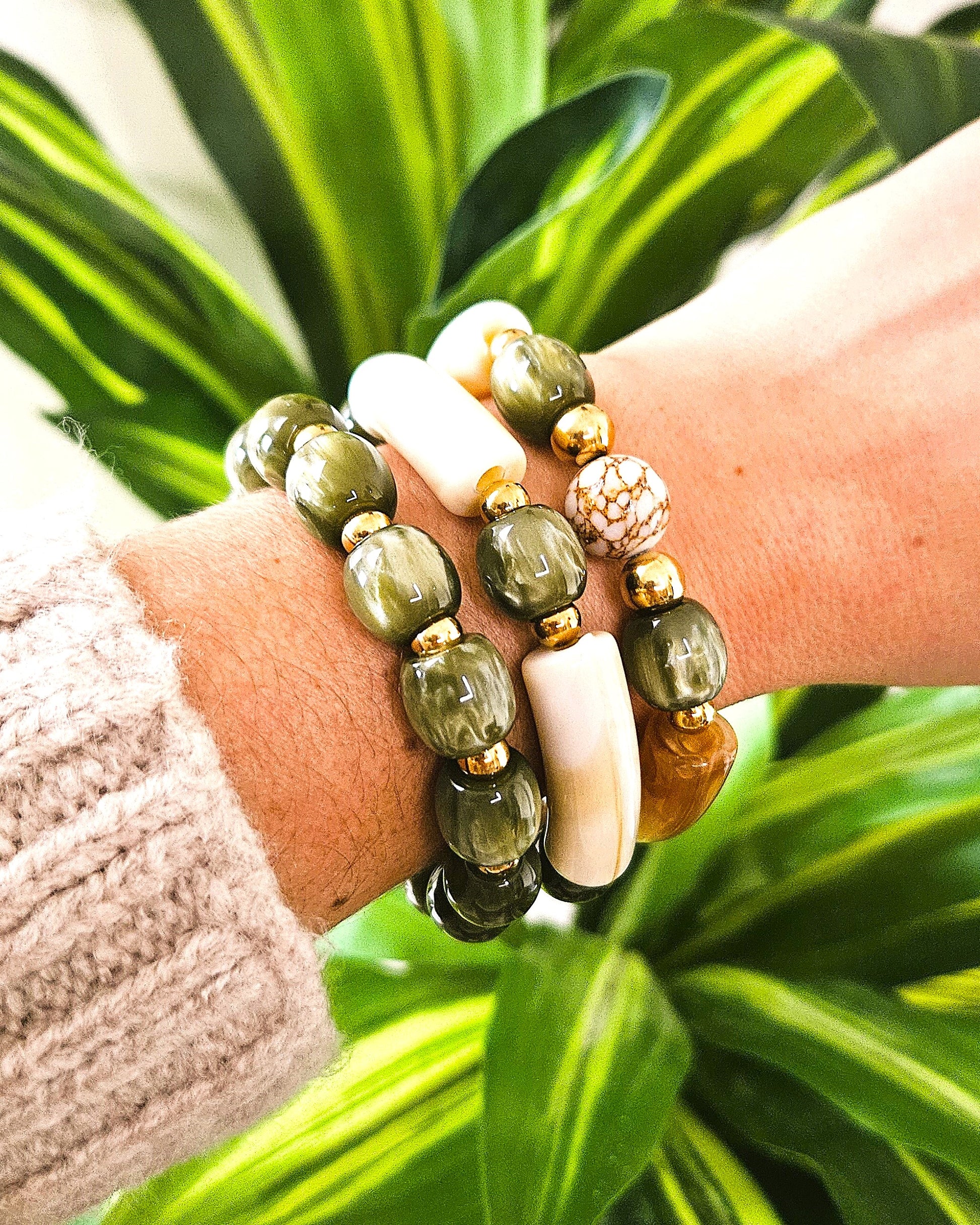 Imaginés et conçus à la main, le trio de bracelets Olive et ses couleurs en plein dans la tendance de la saison illumineront vos tenues avec élégance