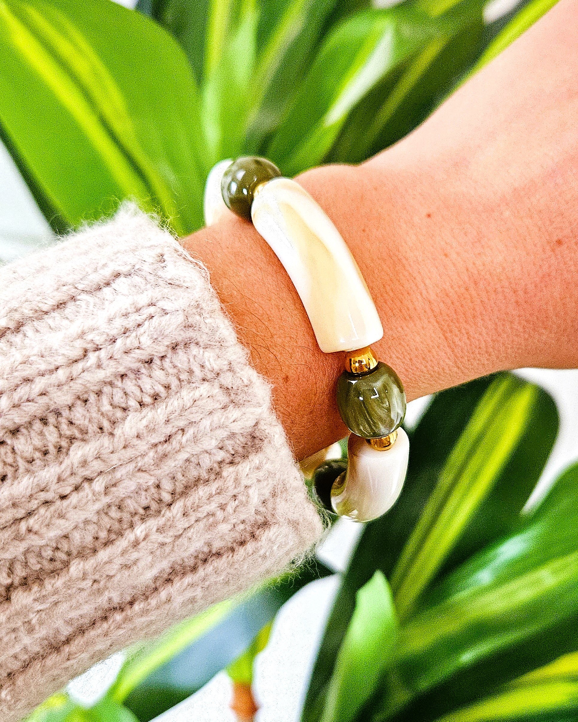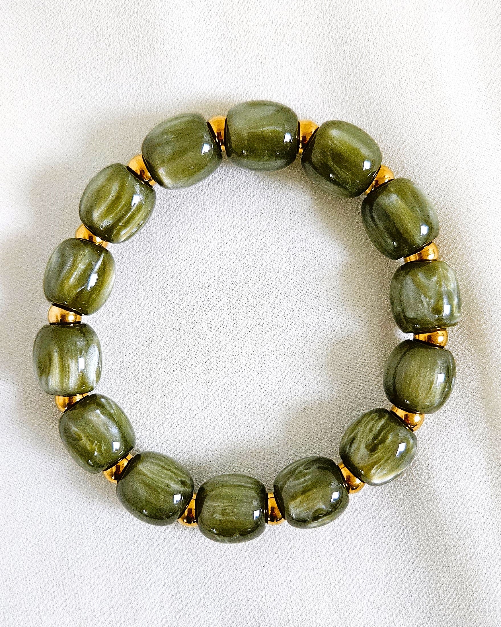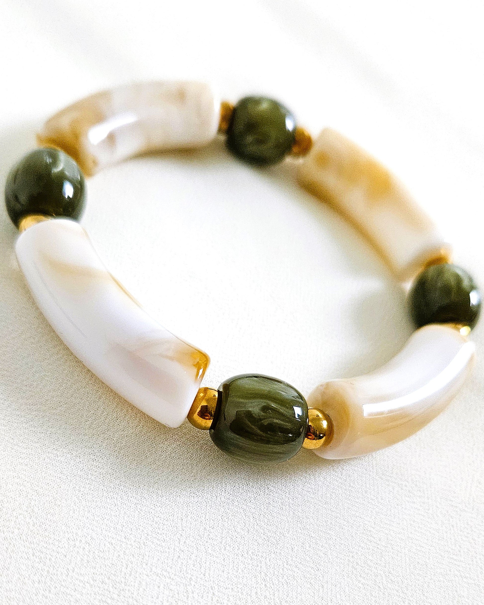 Imaginés et conçus à la main, le trio de bracelets Olive et ses couleurs en plein dans la tendance de la saison illumineront vos tenues avec élégance