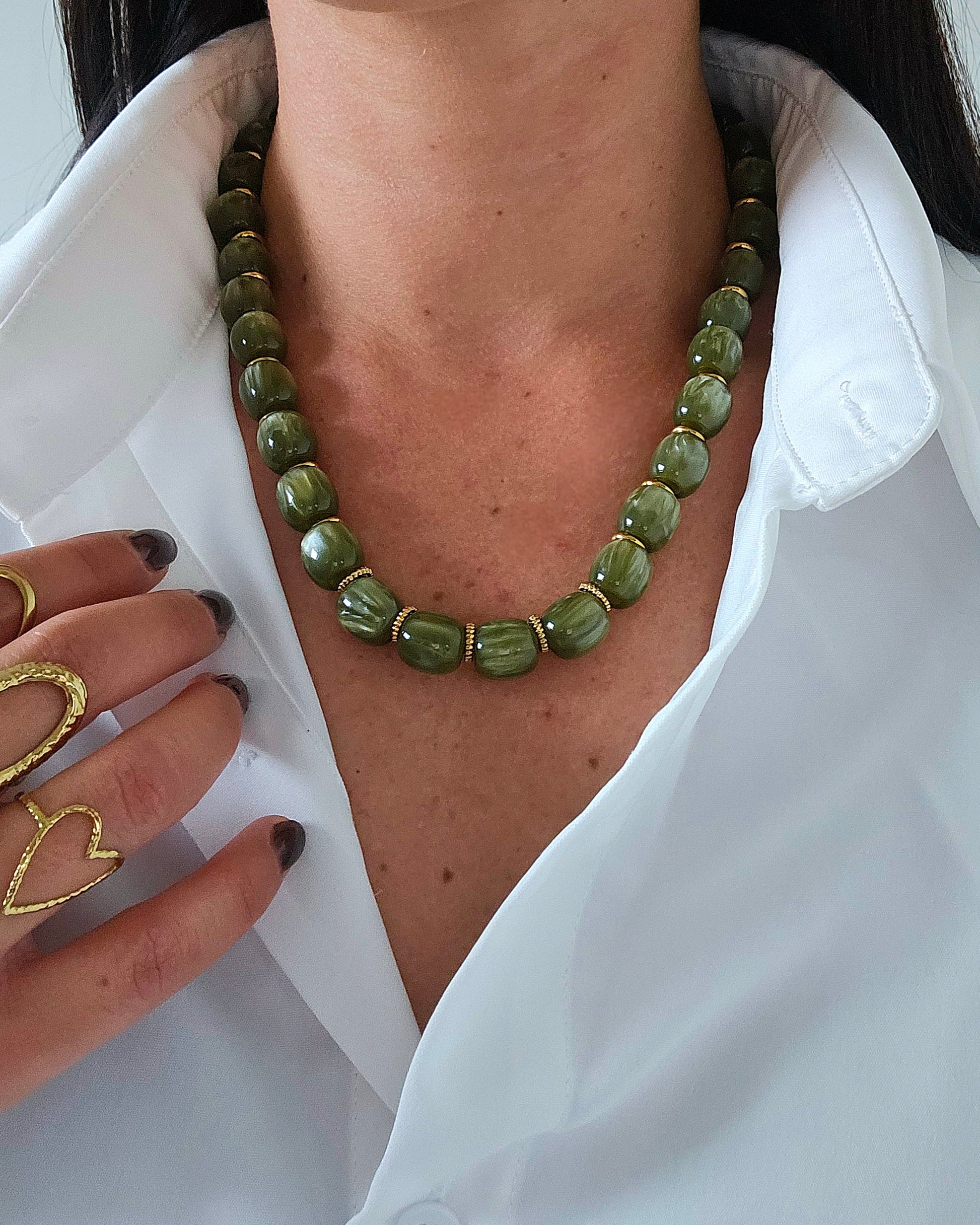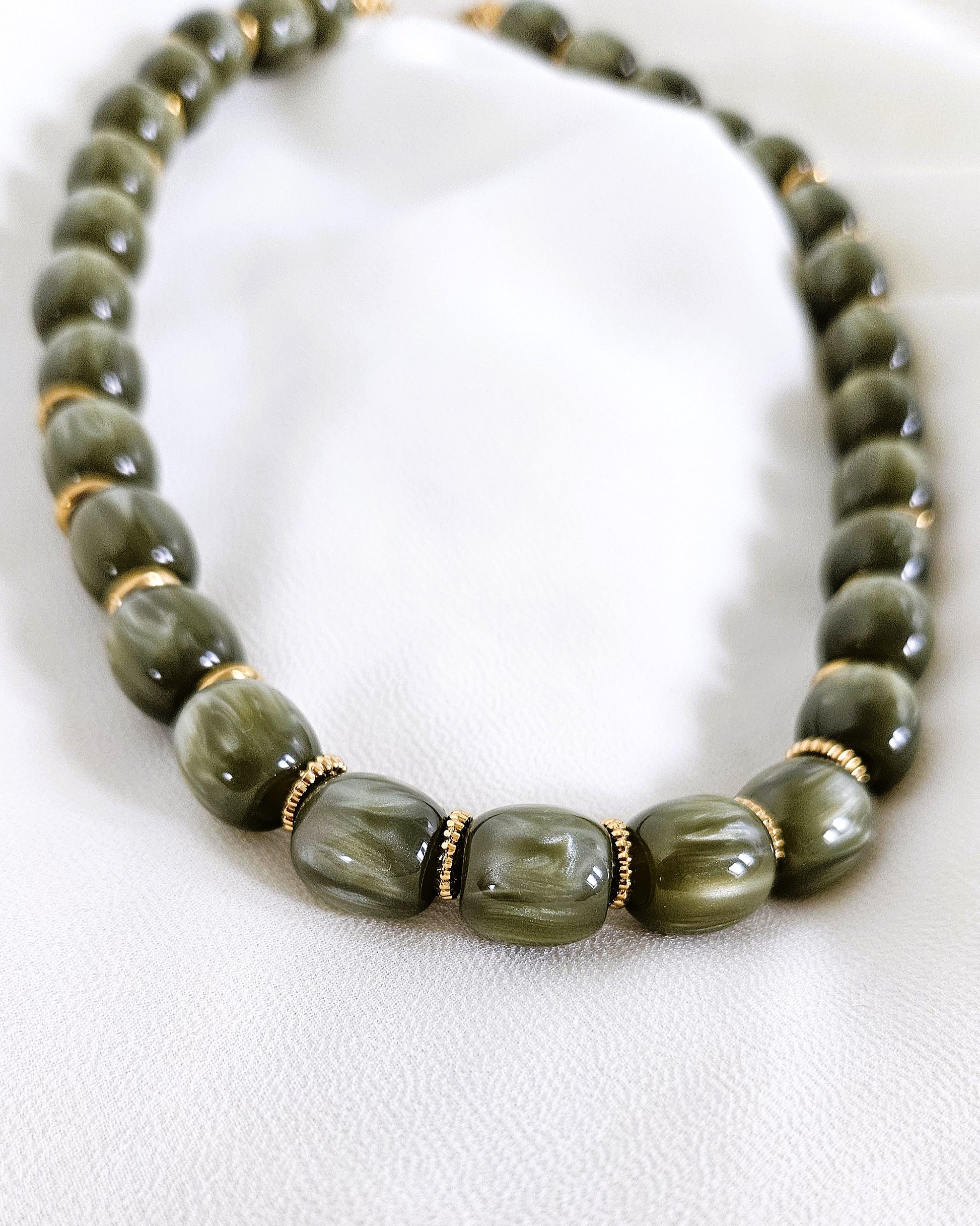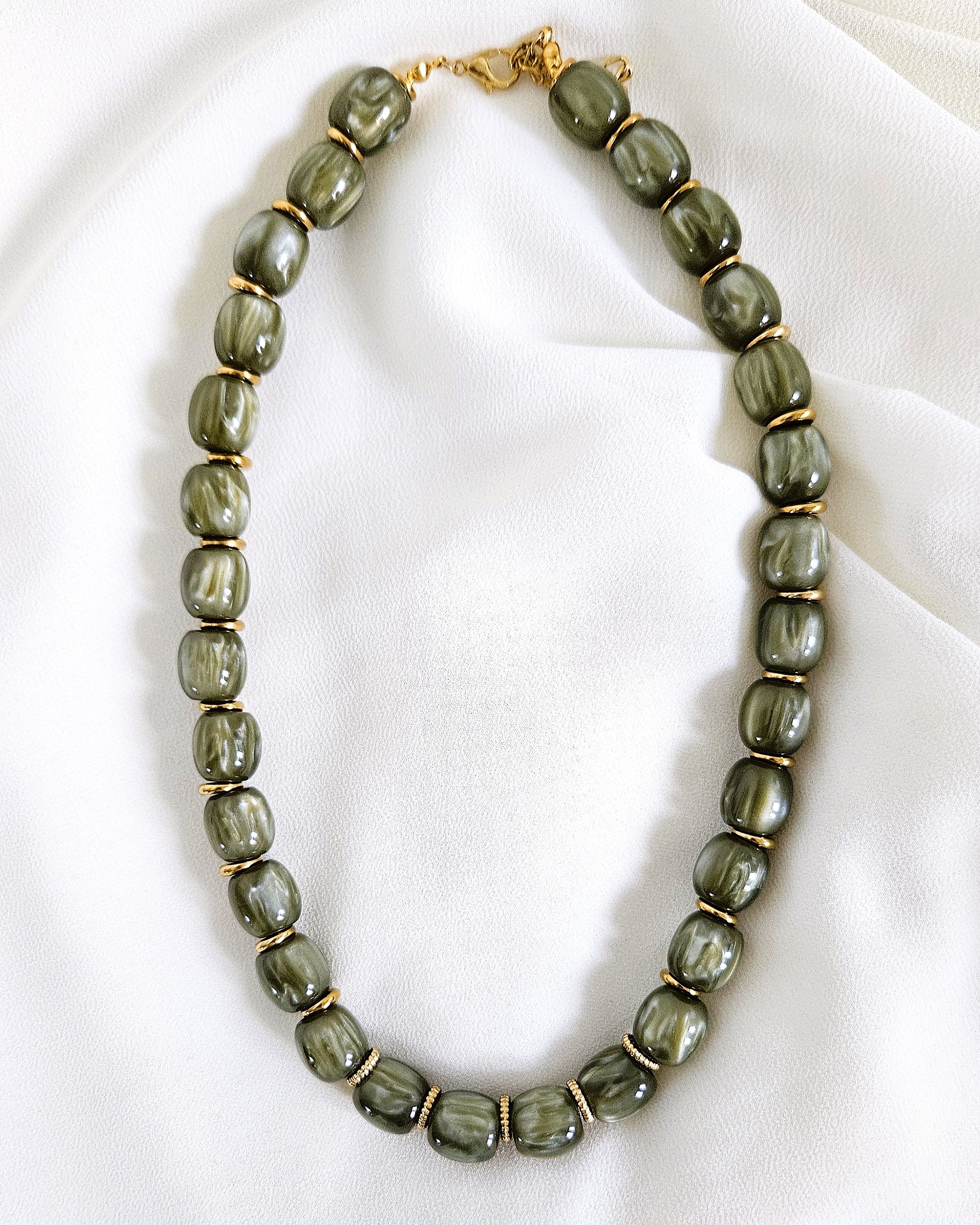 Ses perles délicates vert olive et dorées en plein dans la tendance de cette saison relèveront vos tenues d'automne avec style