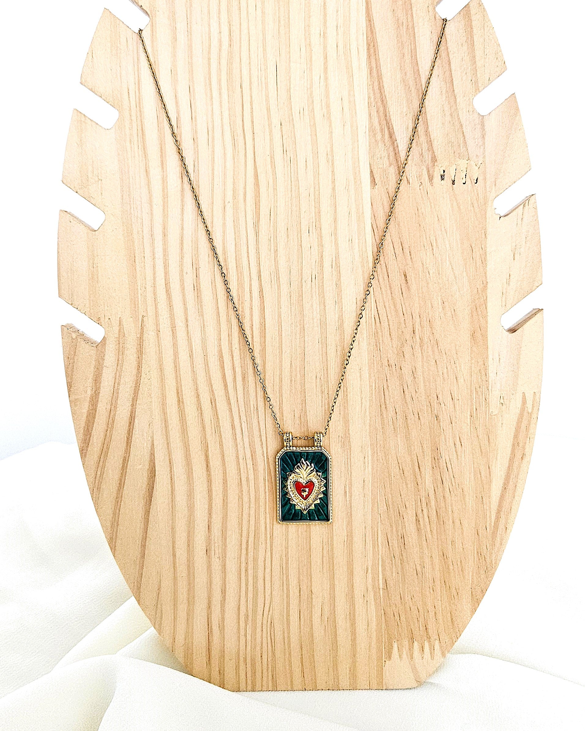 Collier carte rectangulaire aux reflets verts décoré d'un ex-voto rouge et doré, monté sur une fine chaine dorée