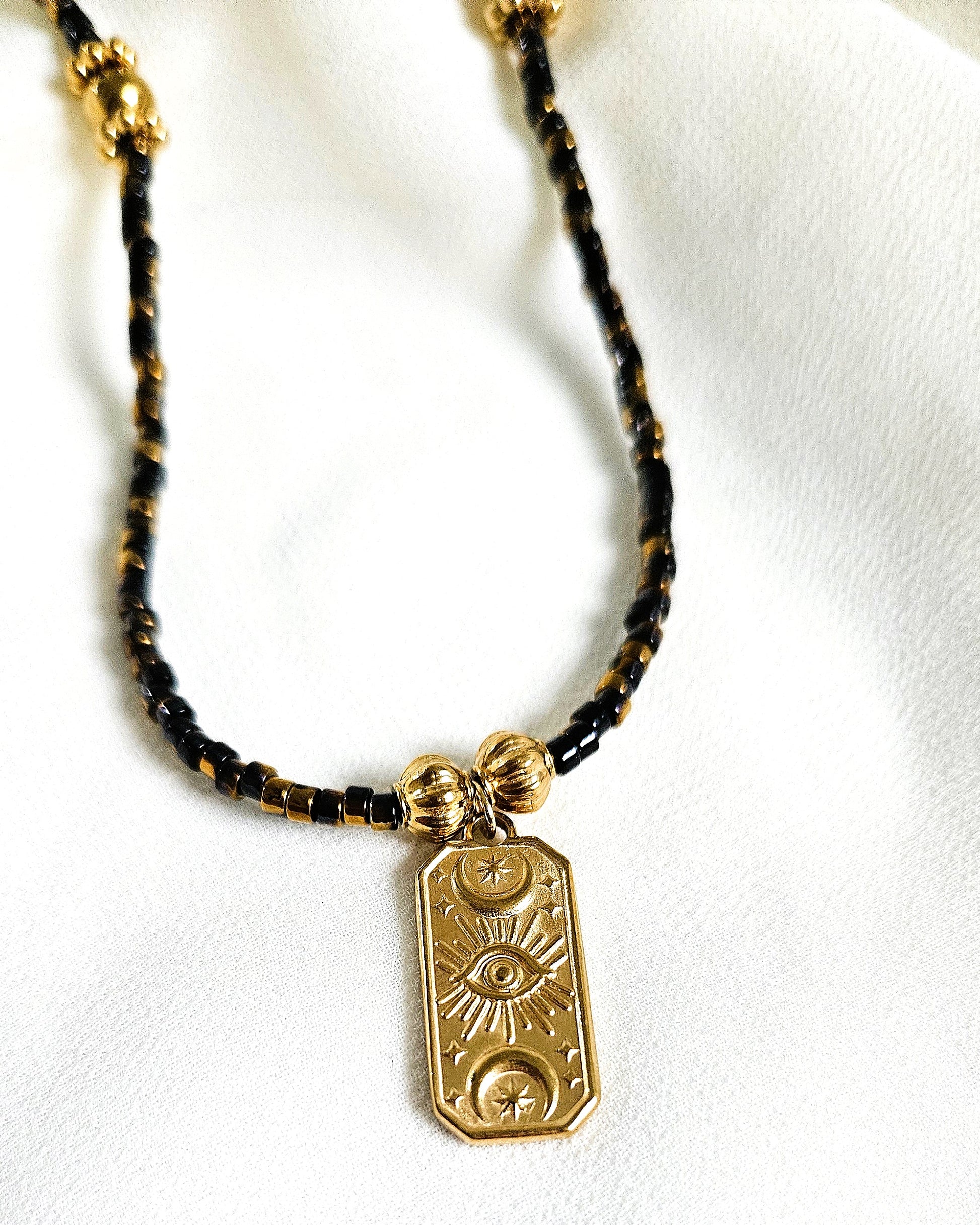 Imaginé et conçu à la main, Le collier Night avec ses fines perles noires aux reflets dorés et son pendentif carte de tarot donnera une touche de finesse et d'élégance à vos tenues