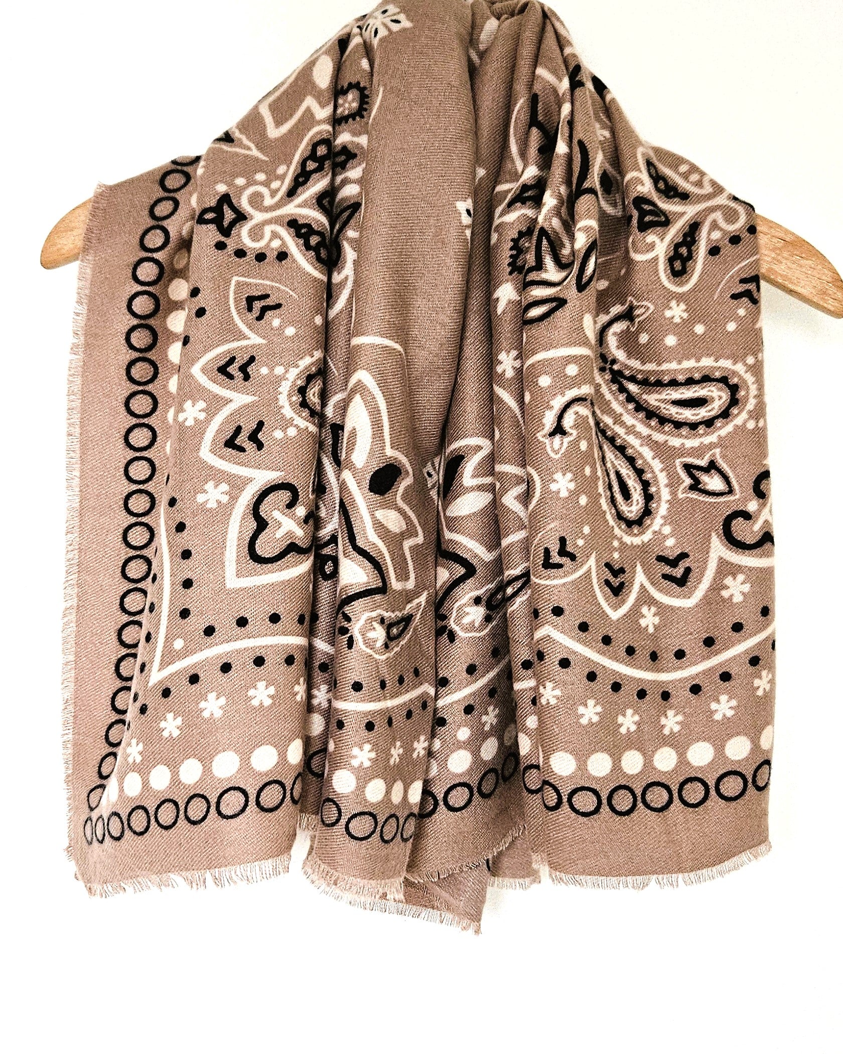Couleur taupe et motif bandana en plein dans la tendance, cette écharpe coche toute les cases pour vous accompagner tout l'hiver