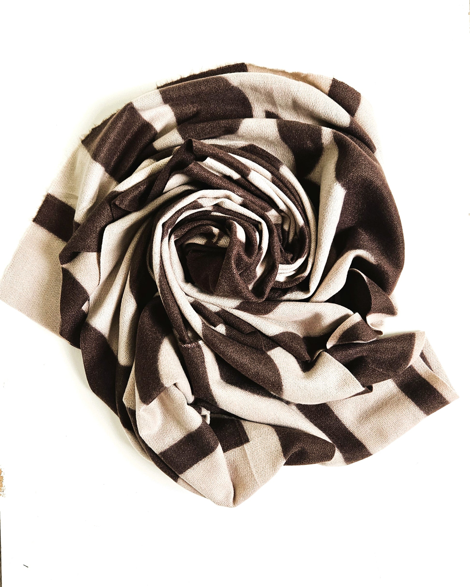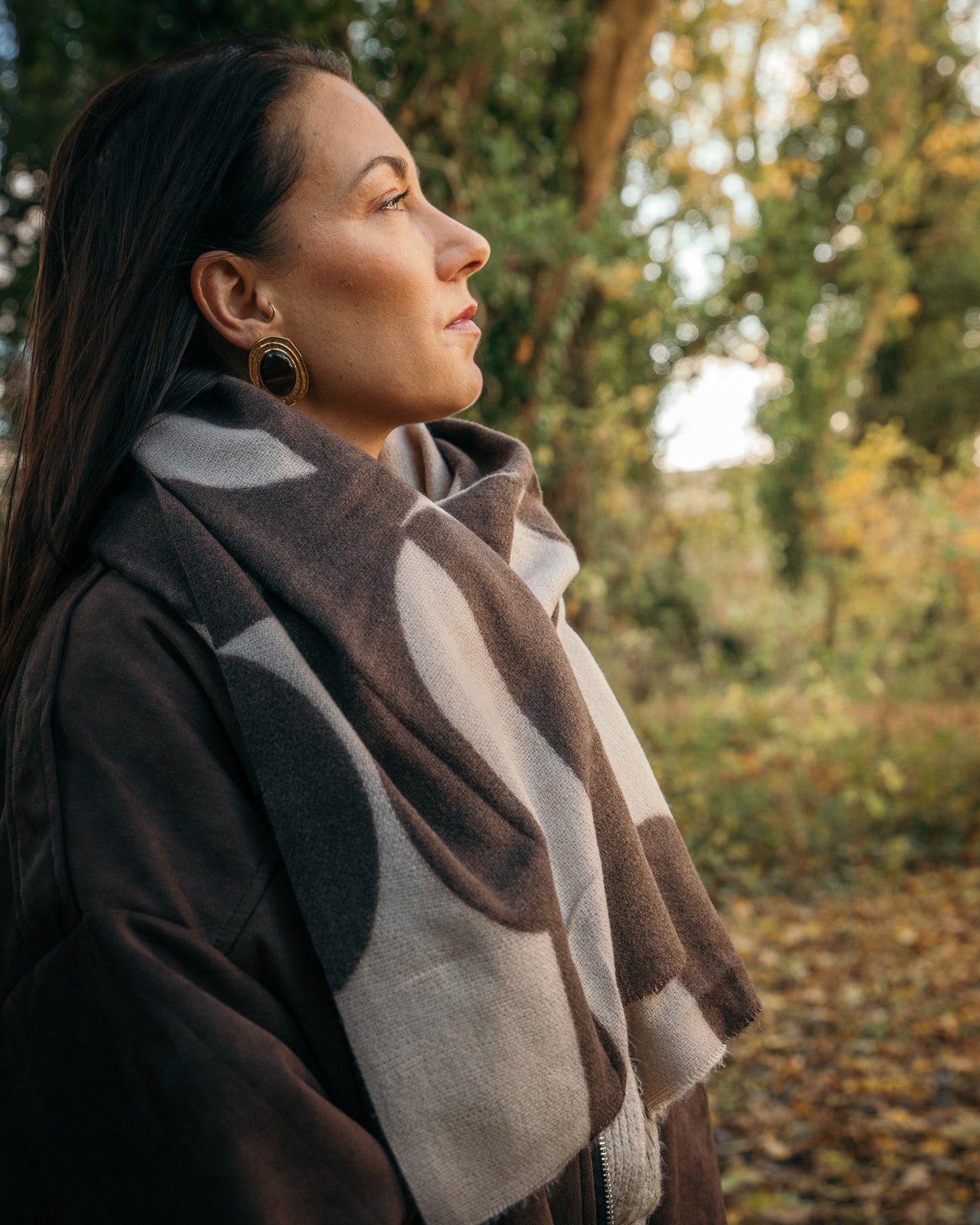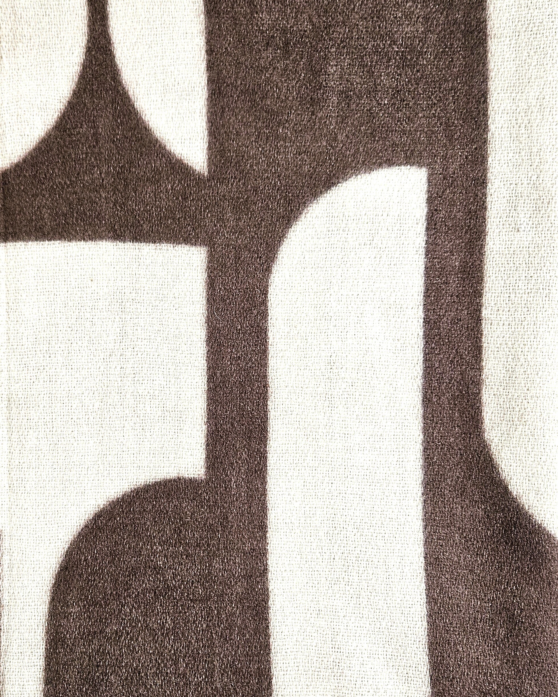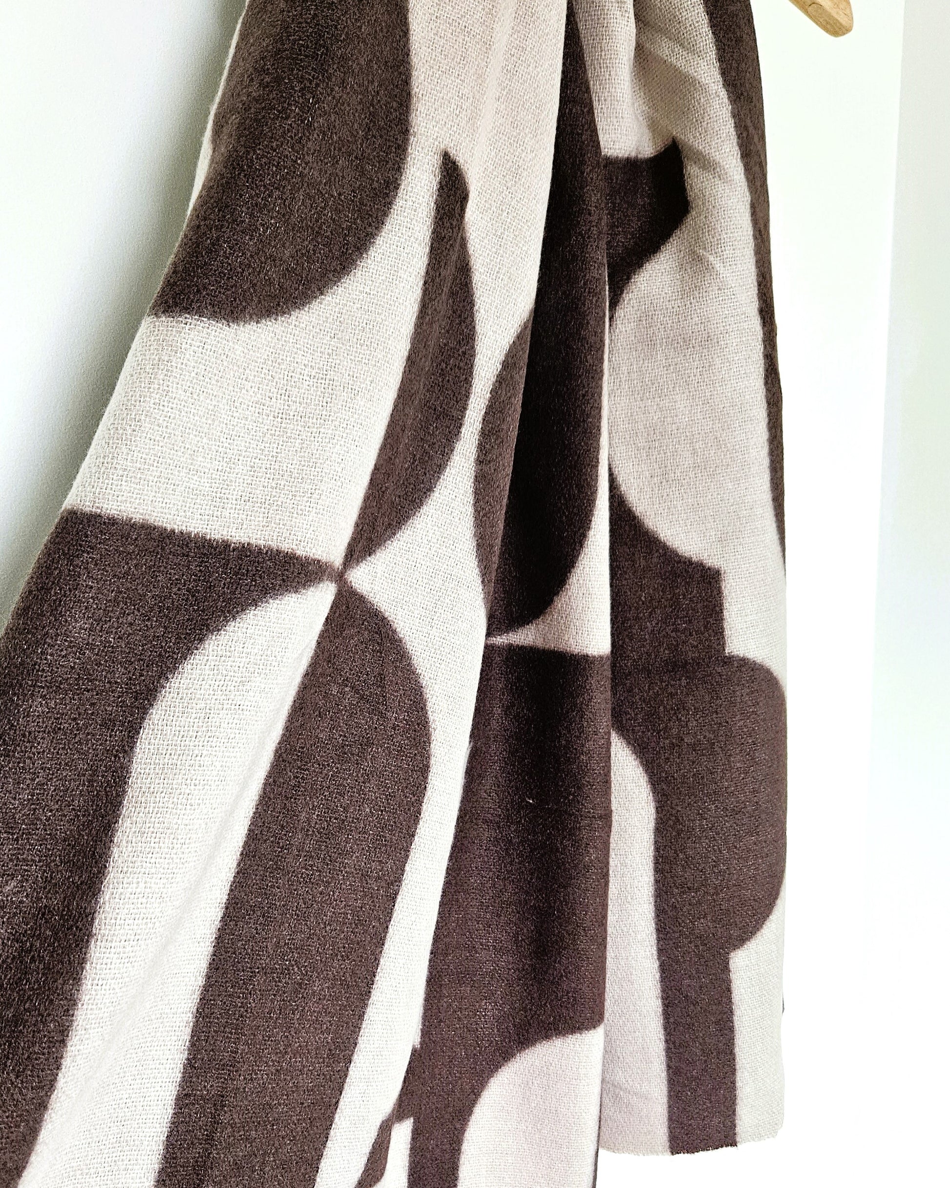 Chaude et réconfortante, cette écharpe toute douce aux motifs géométriques crème et chocolat est en plein dans les tendances actuelles